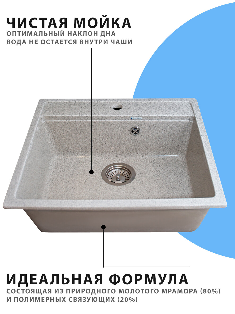 Врезная мойка для кухни из искусственного камня GranAlliance, бежевая с сифоном (551х492х180) 9 264 ₽ Подробнее