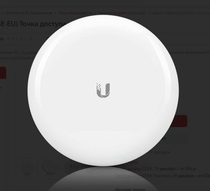 Wi-Fi адаптер Точка доступа Ubiquiti GigaBeam [GBE] Радиоустройство 60 ГГц (с резервированием 5 ГГц), PtP/PtMP, airMAX ac, 17 дБи