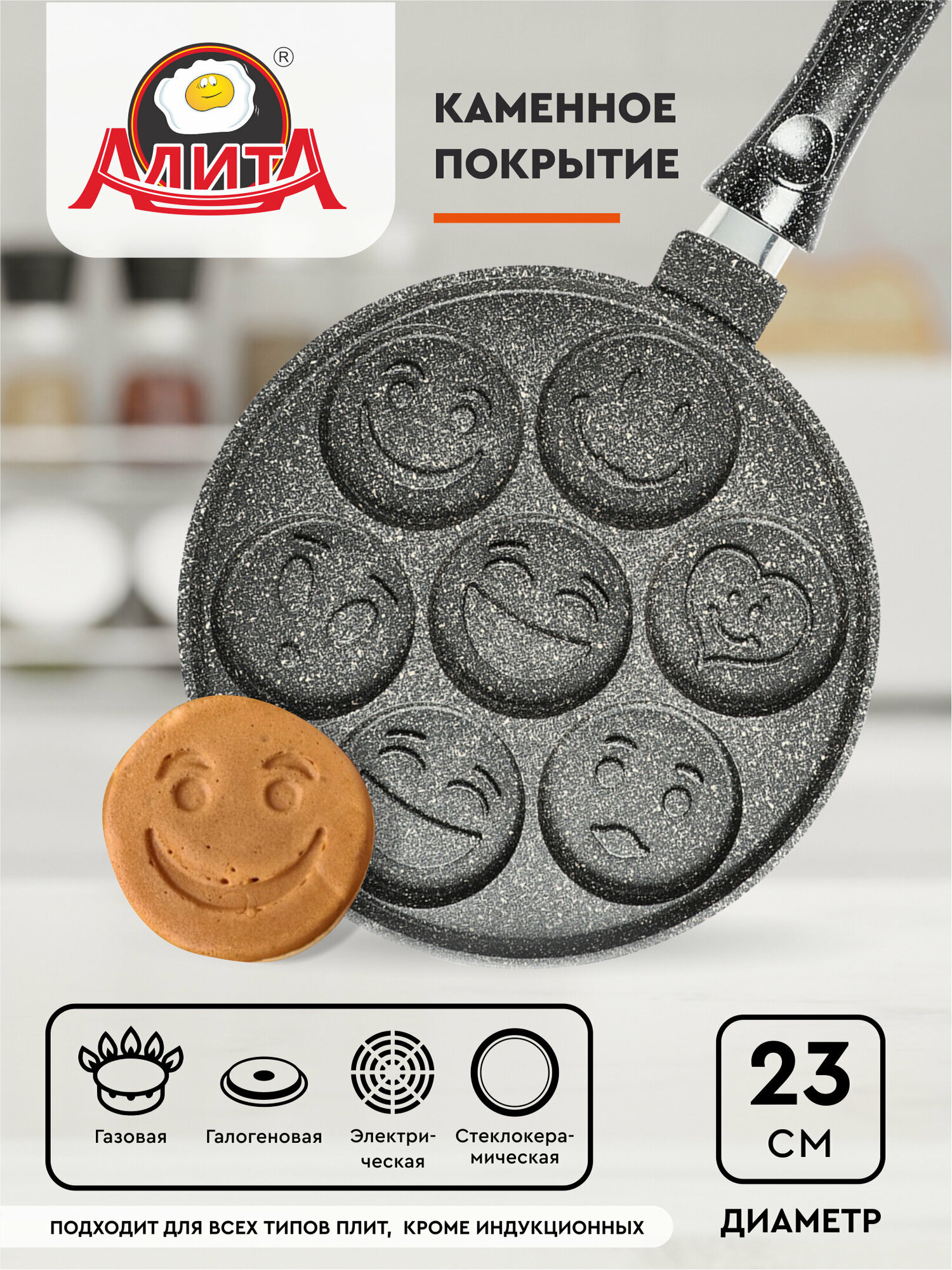 Сковорода для оладий блинная 23см смайл Алита "Оладница" с пл.ручк, АП. 18603