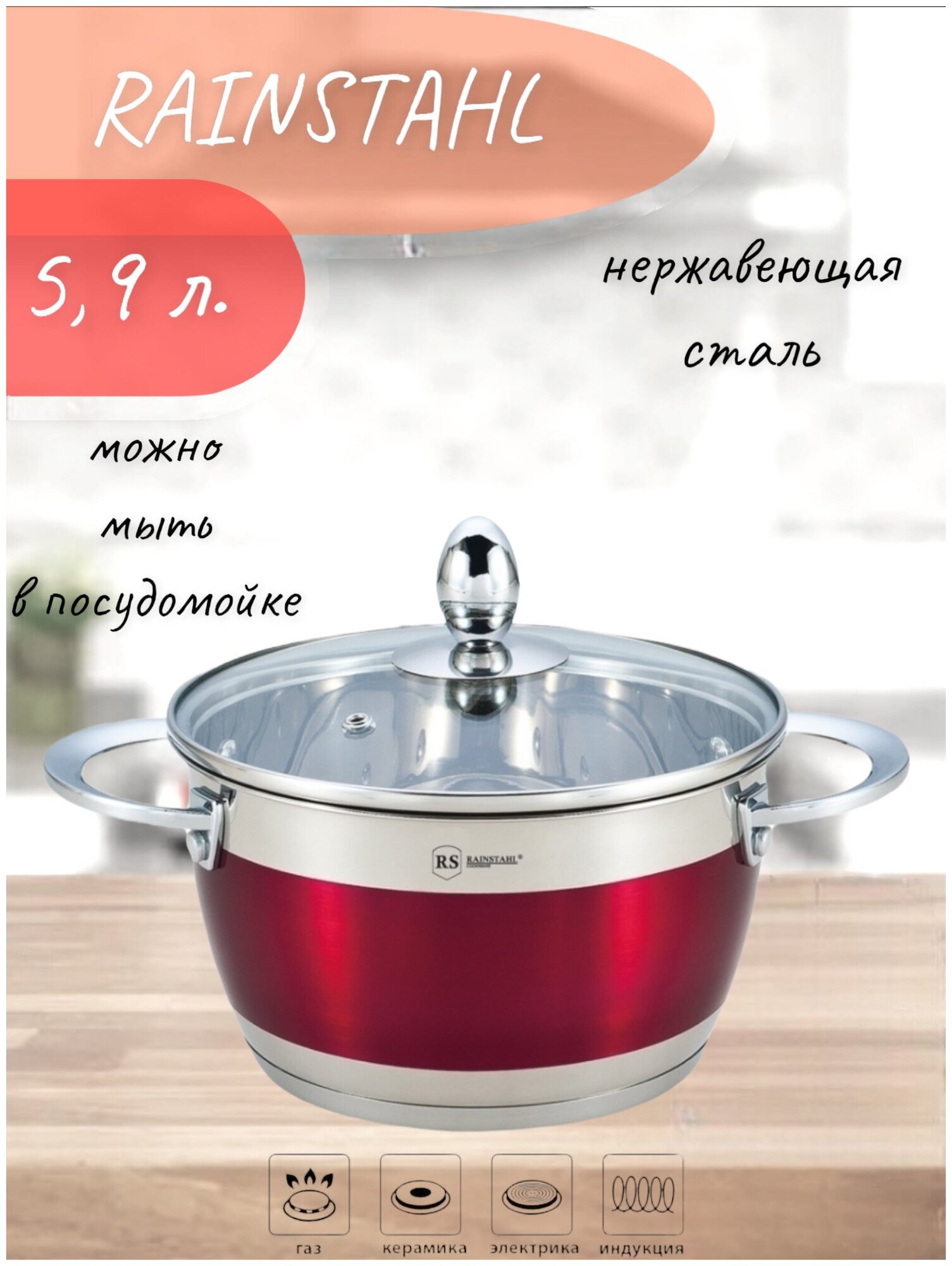 Кастрюли Кастрюля 5.9 л из нержавеющей стали для индукции, Rainstahl RS/CS 1818-24 /Red
