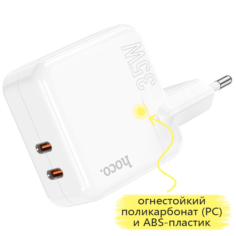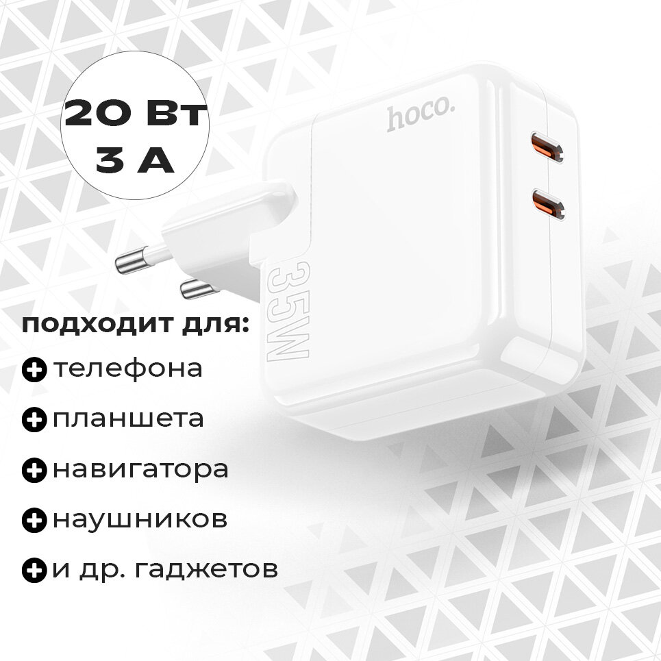 Зарядки для гаджетов Сетевое зарядное устройство для телефона, планшета Hoco, разъемы 2xUSB Type-C, быстрое PD+QC 3.0 35W, белое, для iPhone, Android
