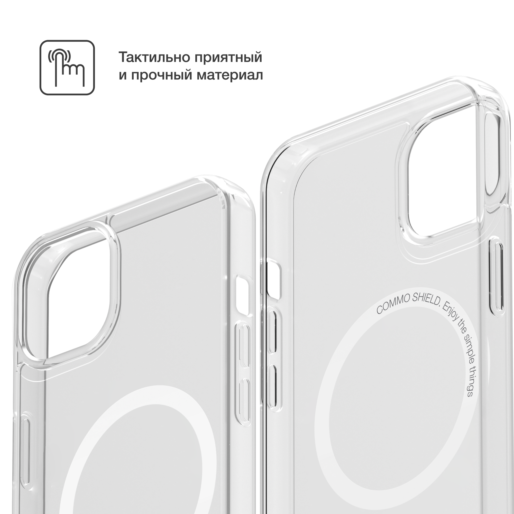 Лучшие цены. Shield Case от COMMO — это прозрачный чехол для iPhone 13 mini с поддержкой беспроводной зарядки. Он создан из высококачественного материала, поэтому приятен на ощупь. Он не скользит в руках и не выглядит громоздким. К тому же его легко снимать и мыть. Магазины в вашем городе.