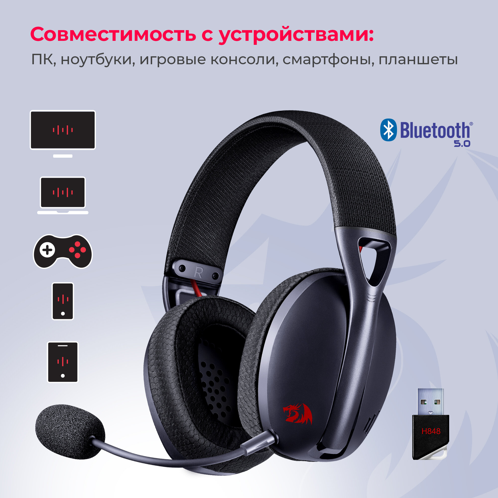 Гарнитура игровая Redragon Ire Pro, для компьютера и игровых консолей, накладные, Bluetooth/радио, черный [71535] 7 500 ₽ Подробнее