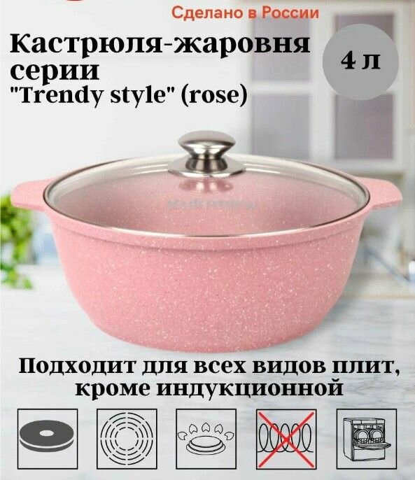 Кастрюли Кастрюля-жаровня антипригарная литая 4,0л со стеклянной крышкой Trendy style rose ТМ KUKMARA