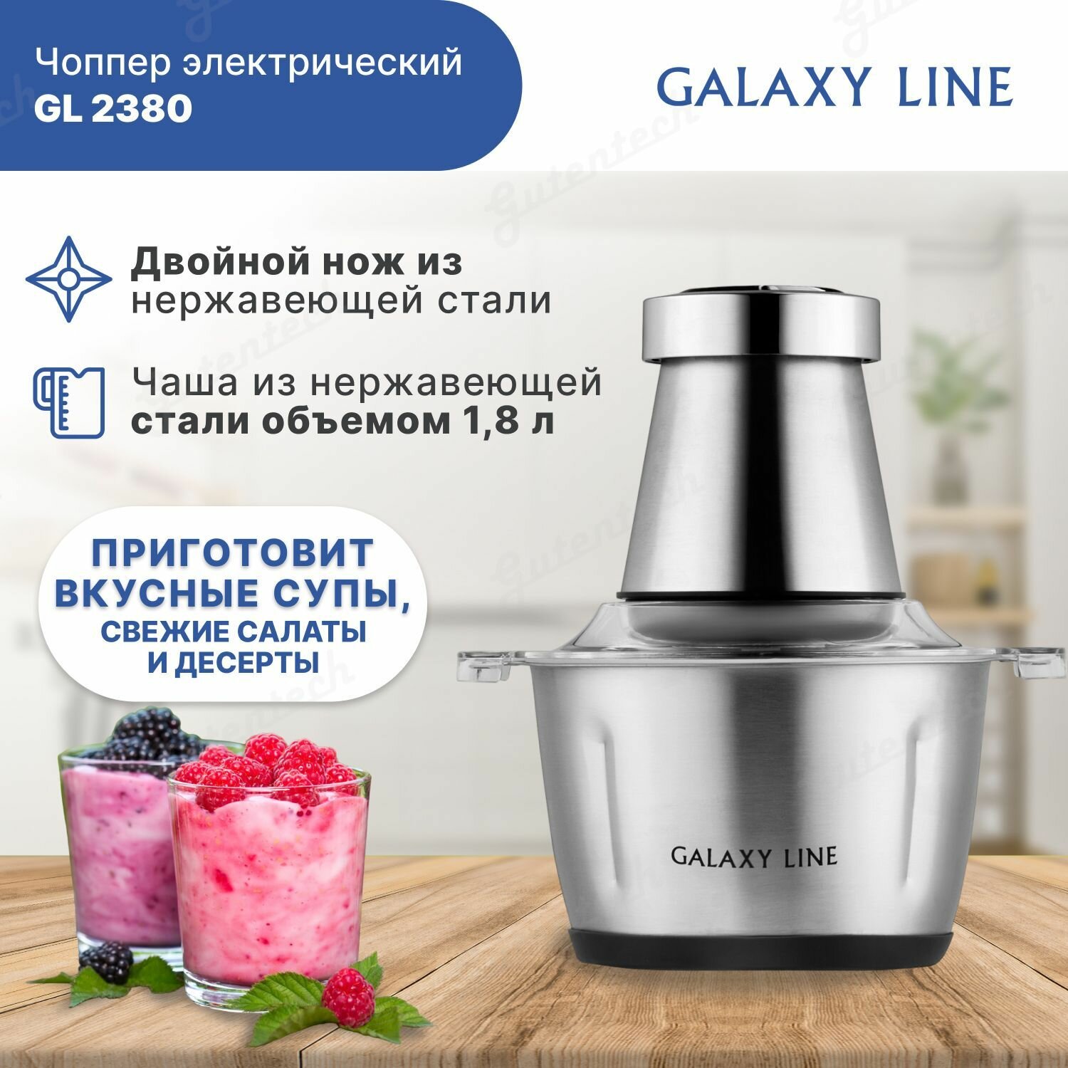 Лучшие цены. Измельчитель кухонный электрический GALAXY LINE GL2380 - многофункциональный прибор, сочетающий в себе функции нарезки и измельчения. Приготовление вкусных супов, свежих салатов гарниров и соблазнительных десертов станет быстрым и легким занятием с кухонными чопперами GALAXY LINE! Прочные и острые двойные ножи с четырьмя лезвиями из нержавеющей стали эффективно и быстро измельчает продукты. Магазины в вашем городе.
