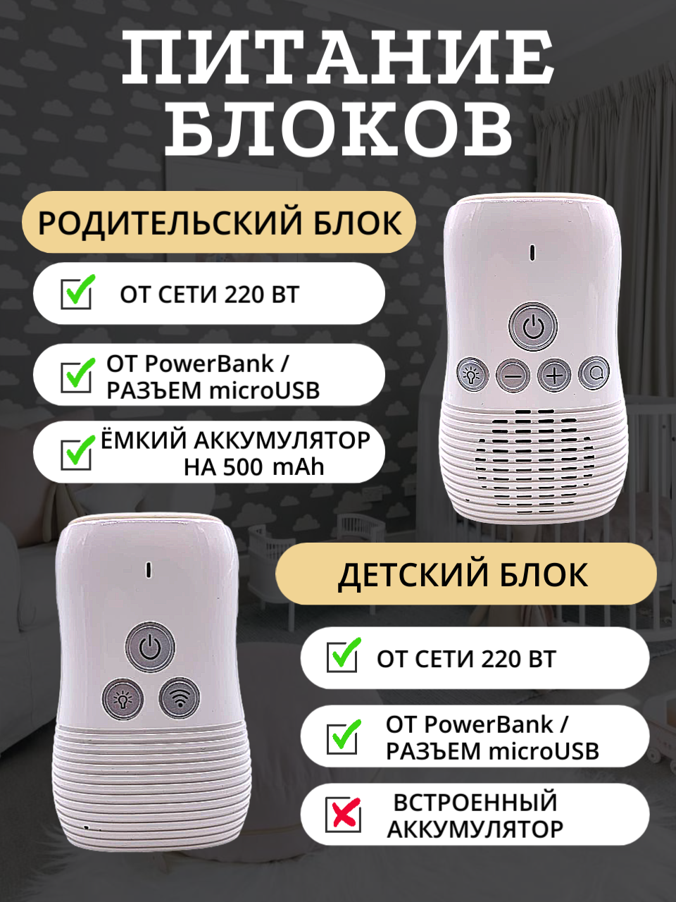 | Детский блок | настройка чувствительности / ночной светильник / ночной режим камеры / ≤ 10 м / / датчик температуры / датчик влажности / совместимость с iOS / совместимость с Android / запись видео с камеры / фотосъемка |