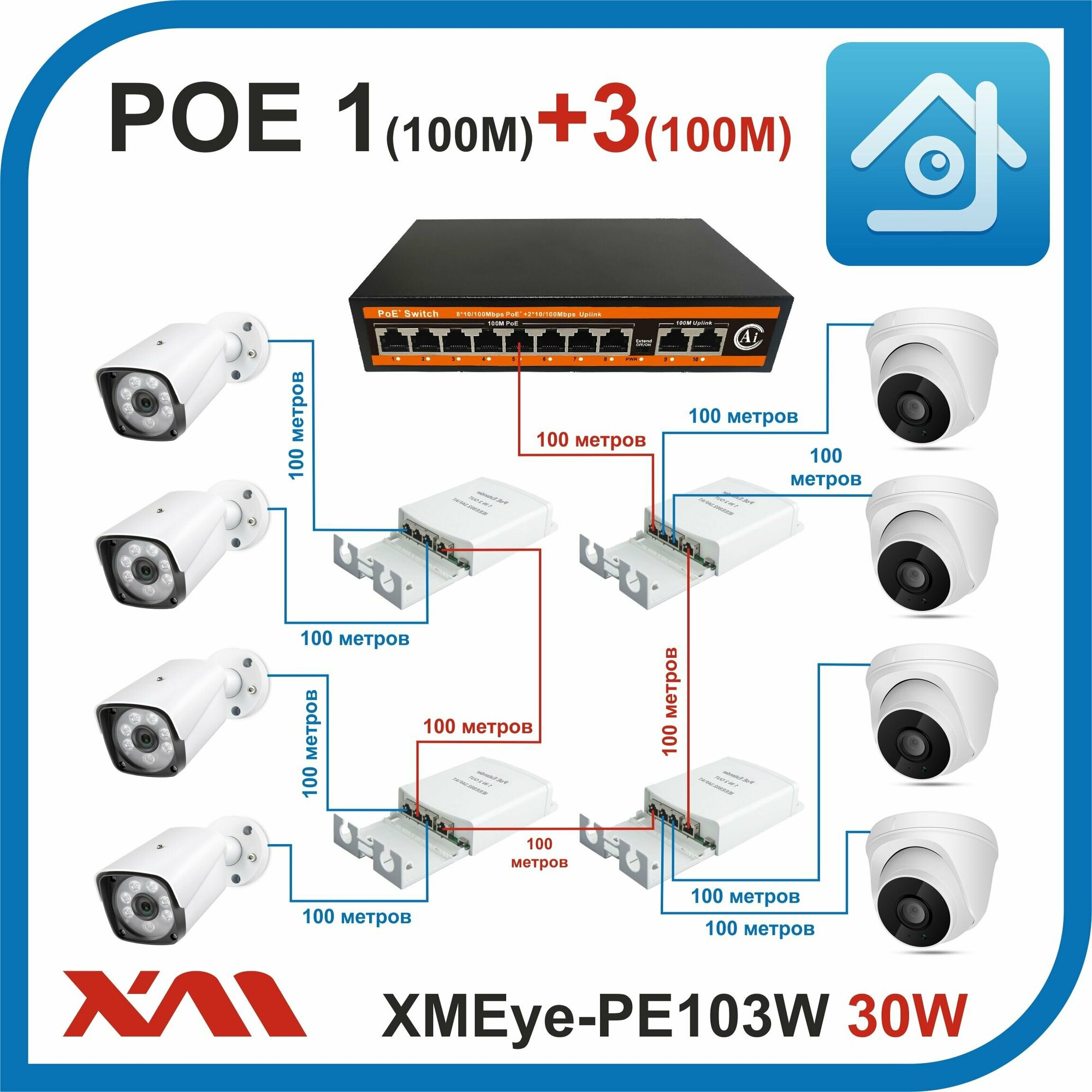 Коммутаторы XMEye-PE103W. 30W. Extender (Экстендер) POE на 1+3 порта (10/100M) для уличной установки.