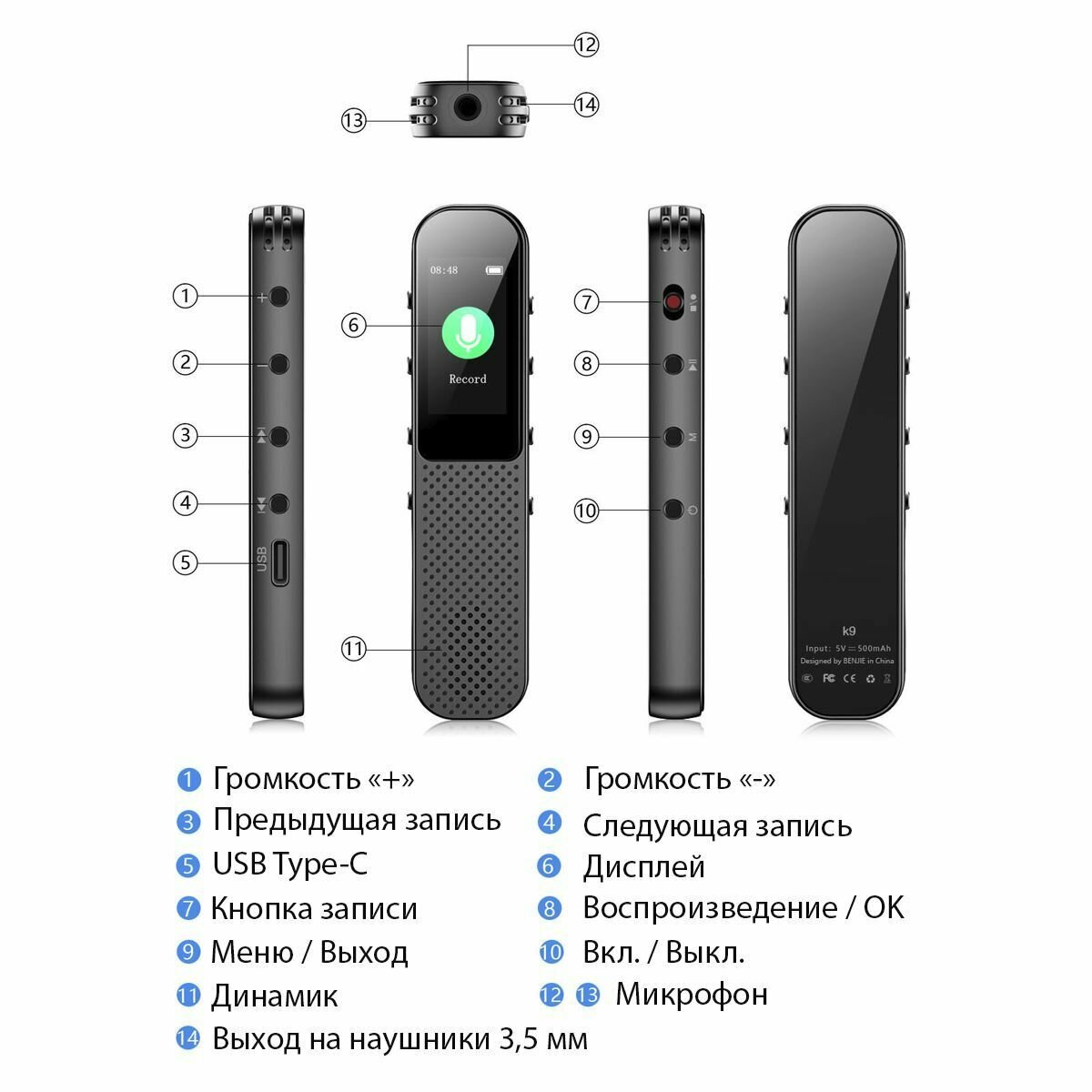 Диктофоны и рекордеры BENJIE K9 Цифровой диктофон с MP3-плеером и встроенным динамиком, 64 Гб