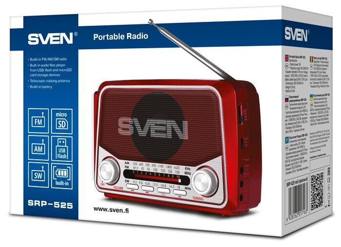 SVEN SRP-525, красный, радиоприемник, мощность 3 Вт (RMS), FM/AM/SW, USB, microSD, фонарь, встроенный аккумулятор