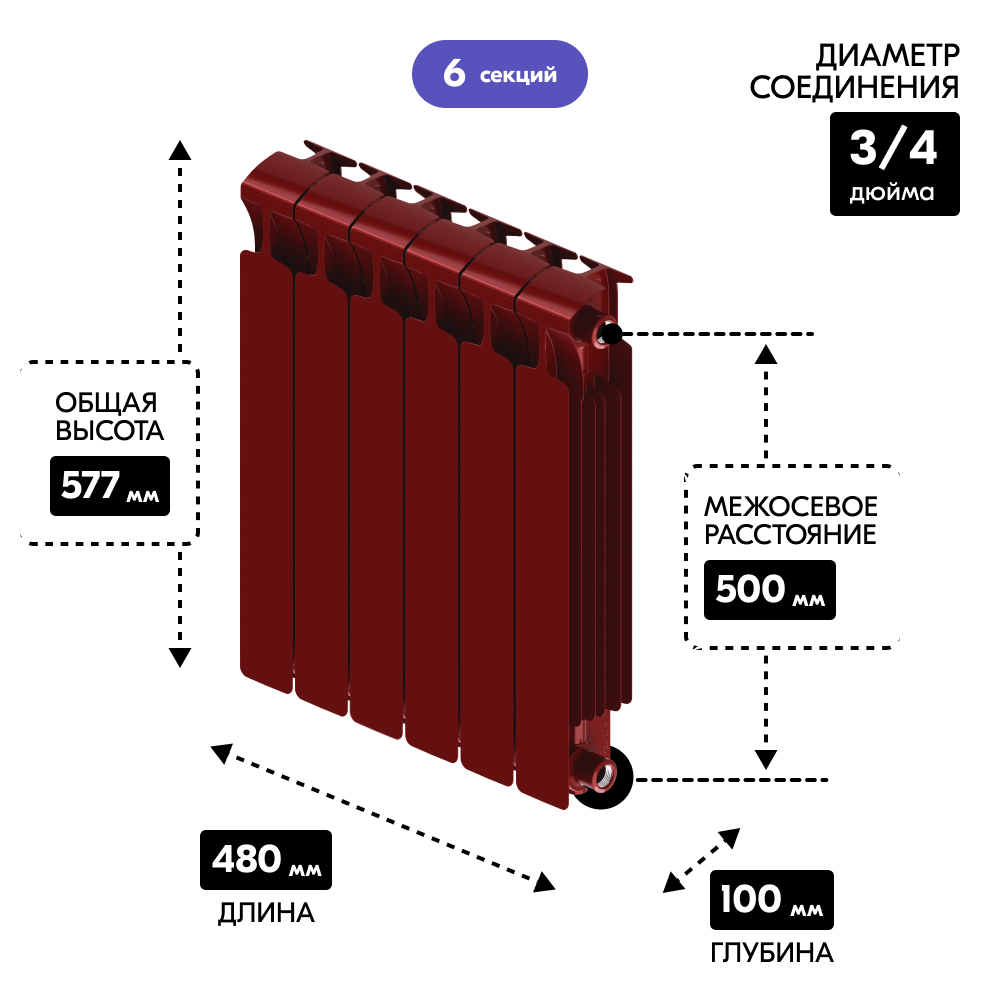 Радиатор отопления Rifar Monolit 500 - 6 секций, цвет Бордо (RAL 3011 красный) боковое подключение