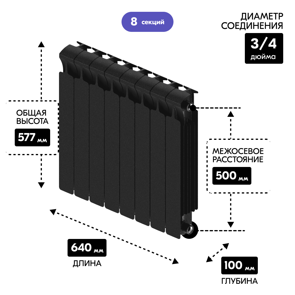 Rifar Monolit 500 - 12 секций, цвет Антрацит (чёрный) боковое подключение 21 840 ₽ Подробнее