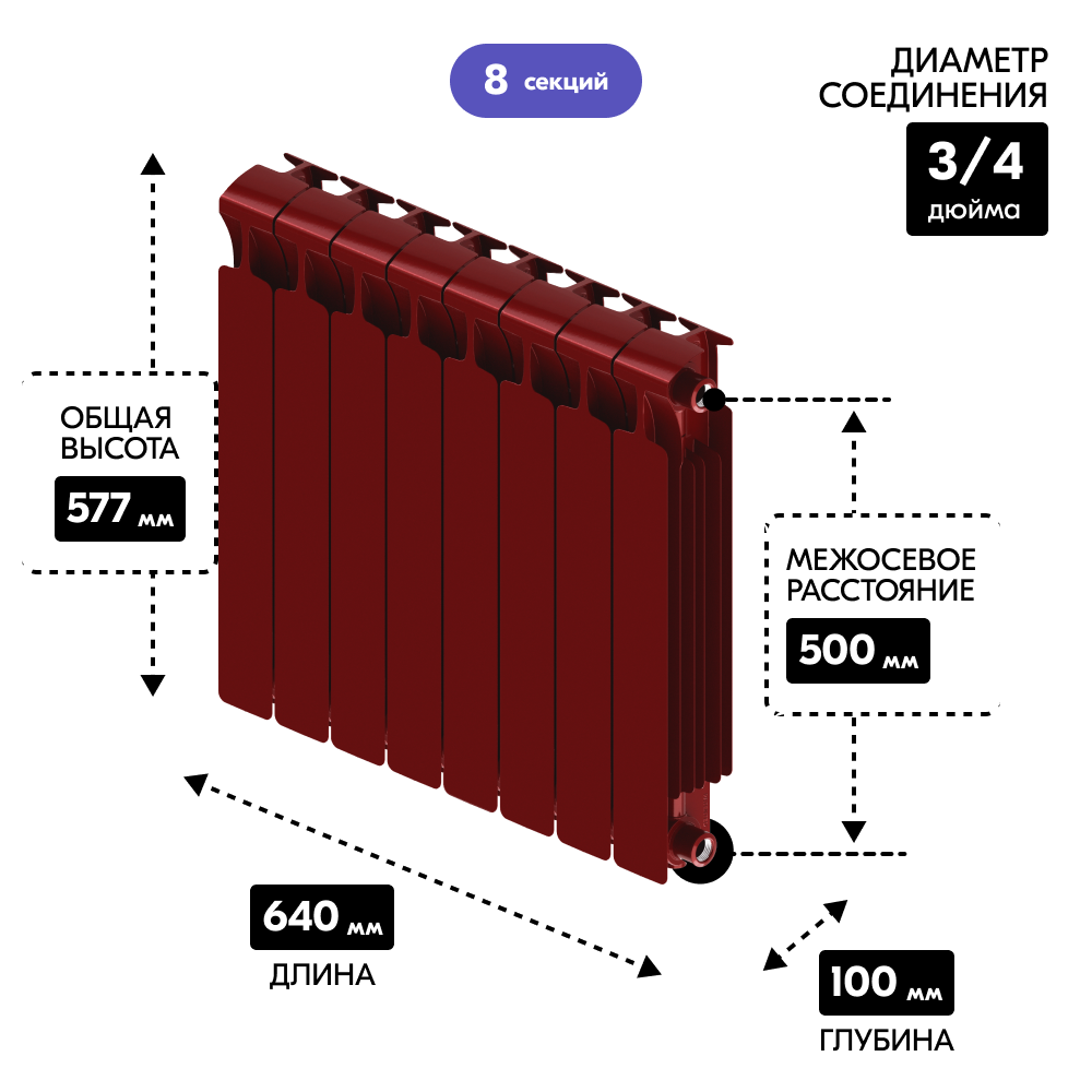 Радиатор отопления Rifar Monolit 500 - 8 секций, цвет Бордо (RAL 3011 красный) боковое подключение