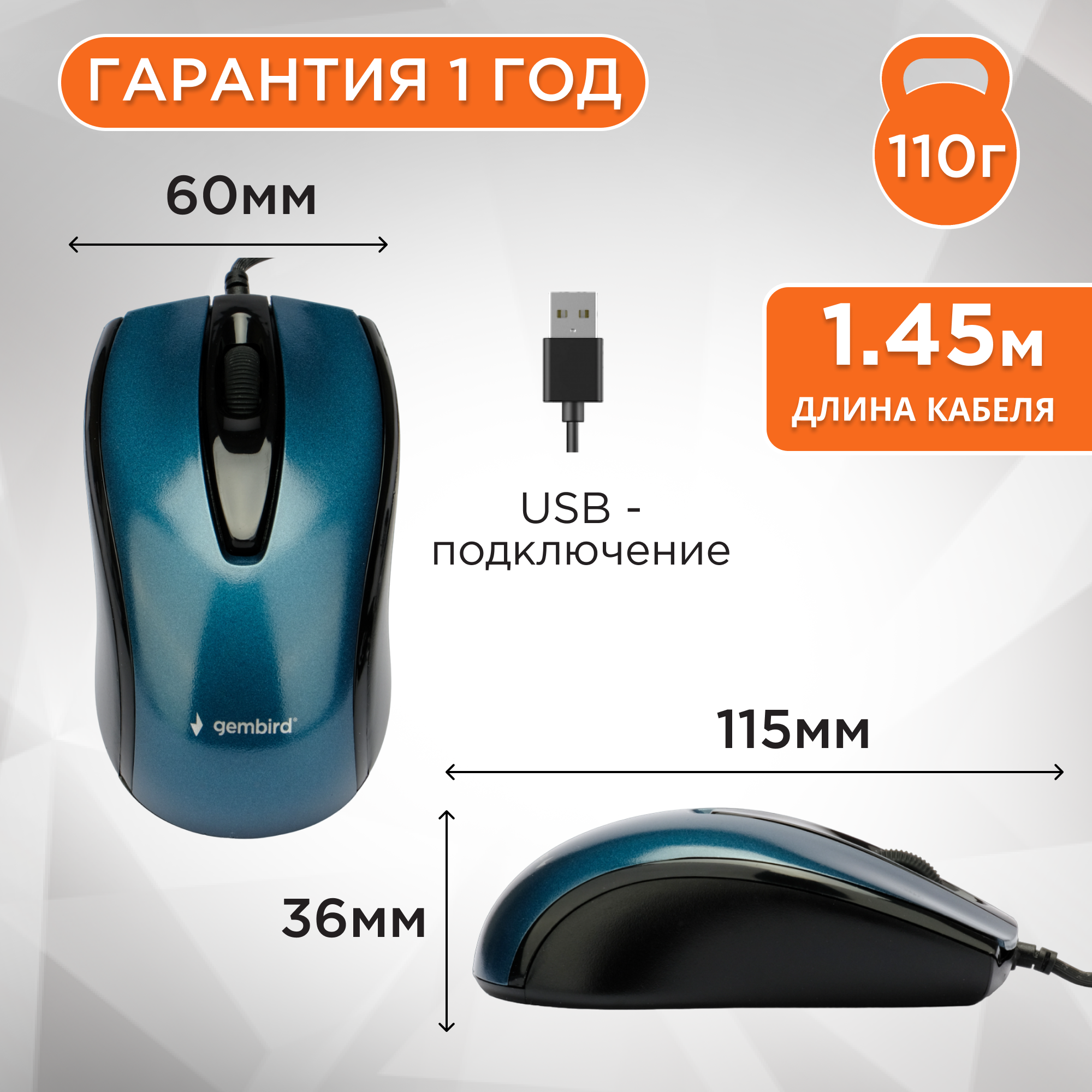 Мышь Gembird MOP-405-B, USB, синий, объемный цвет, бесшум клик, 2 кнопки+колесо кнопка, 1000 DPI, кабель 1.45 м