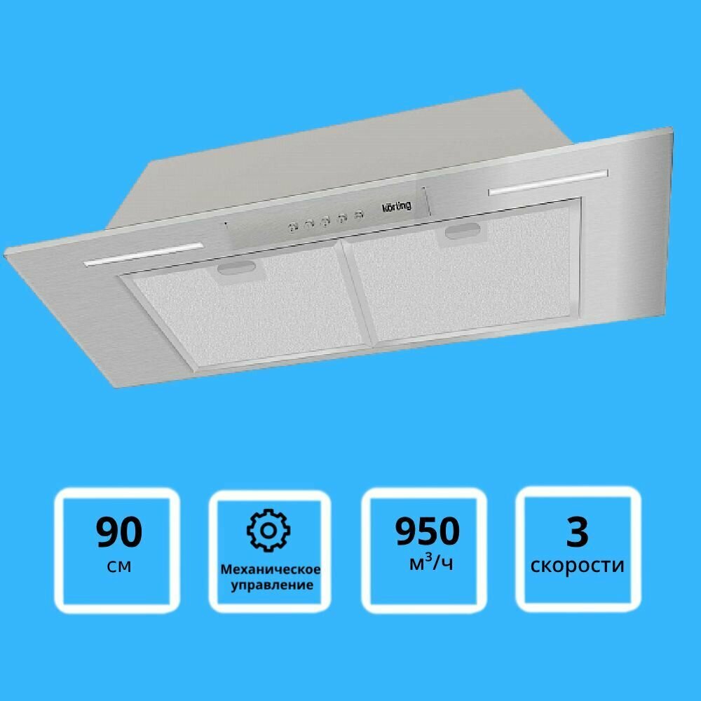 KORTING Полностью встраиваемая вытяжка (блок) , в шкаф 90см, механическое управление, 3 режима, 950м3 / ч., алюминиевый жировой фильтр, LED освещение, ур.шума 56дб, цвет - слоновая кость, кнопки-бронза 10 146 ₽ Подробнее