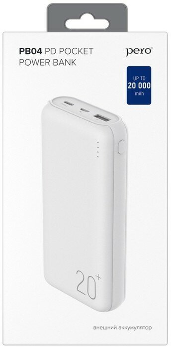 Портативный аккумулятор PERO PB04 20000 mAh, Li-Pol, output USB-C PD + USB-A QC 3.0, 3A, белый