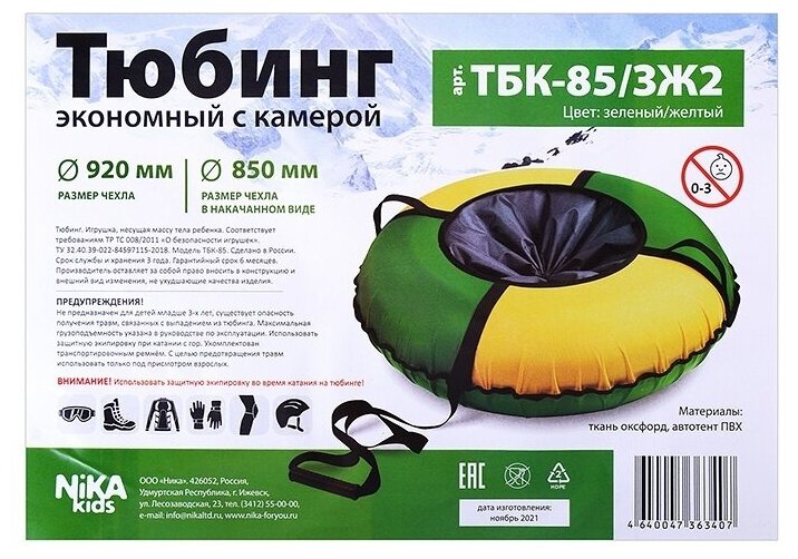 Nika Надувная ватрушка (тюбинг) 85см "Экономный" зеленый/желтый с автокамерой ТБК-85/ЗЖ2