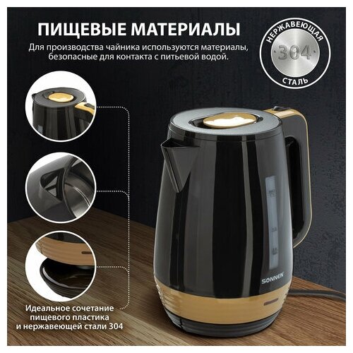 Чайник SONNEN KT-1776 1 7 л 2200 Вт закрытый нагревательный элемент пластик черный/горчичный, 1 шт
