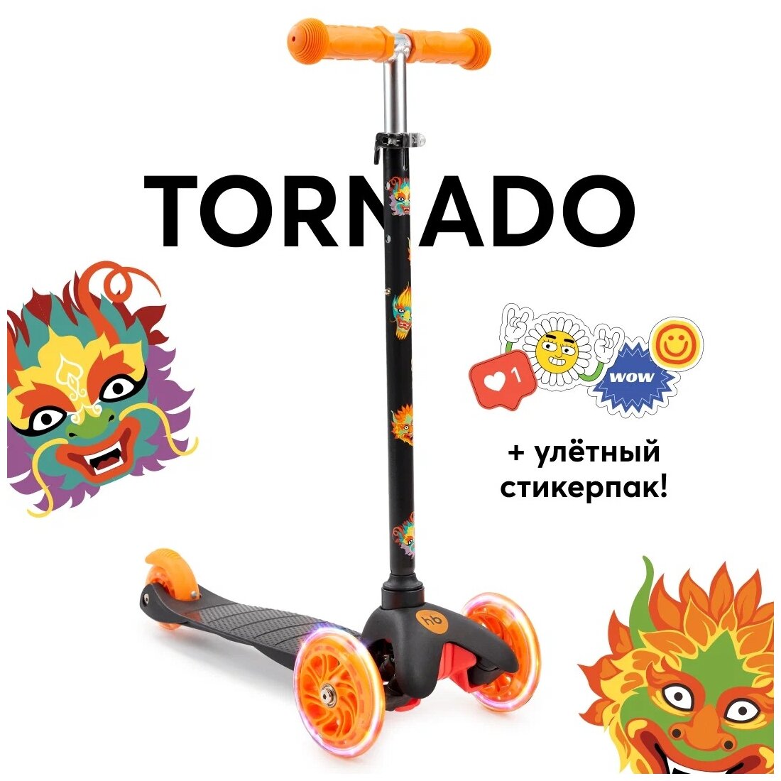 50005, Самокат детский Happy Baby TORNADO, самокат трехколесный детский, светящиеся колеса, наклейки, оранжевый