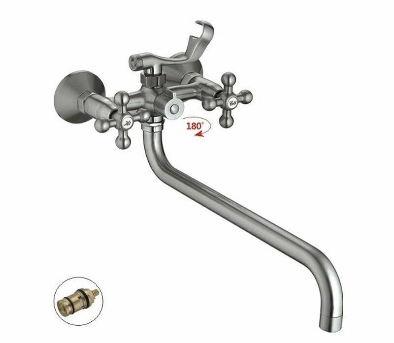 Лучшие цены. Смеситель для ванны Haiba HB2619-5 с душевым гарнитуром. Технические данные: - Цвет: сатин. - Материал: латунь. - Тип излива: поворотный. - С аэратором. - Механизм: керамическая кран-букса. - Управление: двухвентильное. - С девиатором (поворот 90 градусов). - Ручной душ: на 1 режим струи. - Поворотный держатель ручного душа. - Шланг металлический: 1,5 м. - Тип подводки: жесткая. - Стандарт подключения: G 1/2. - Монтаж: на стену. В комплекте поставки: - Смеситель. - Ручной душ. - Держатель душа. - Шланг. Магазины в вашем городе.