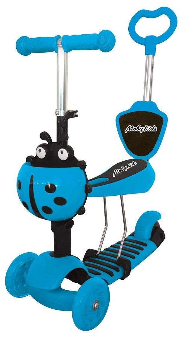 Самокат для малышей "Moby Kids Божья Коровка" 3в1 (синий) (с ручкой, светящиеся колеса)