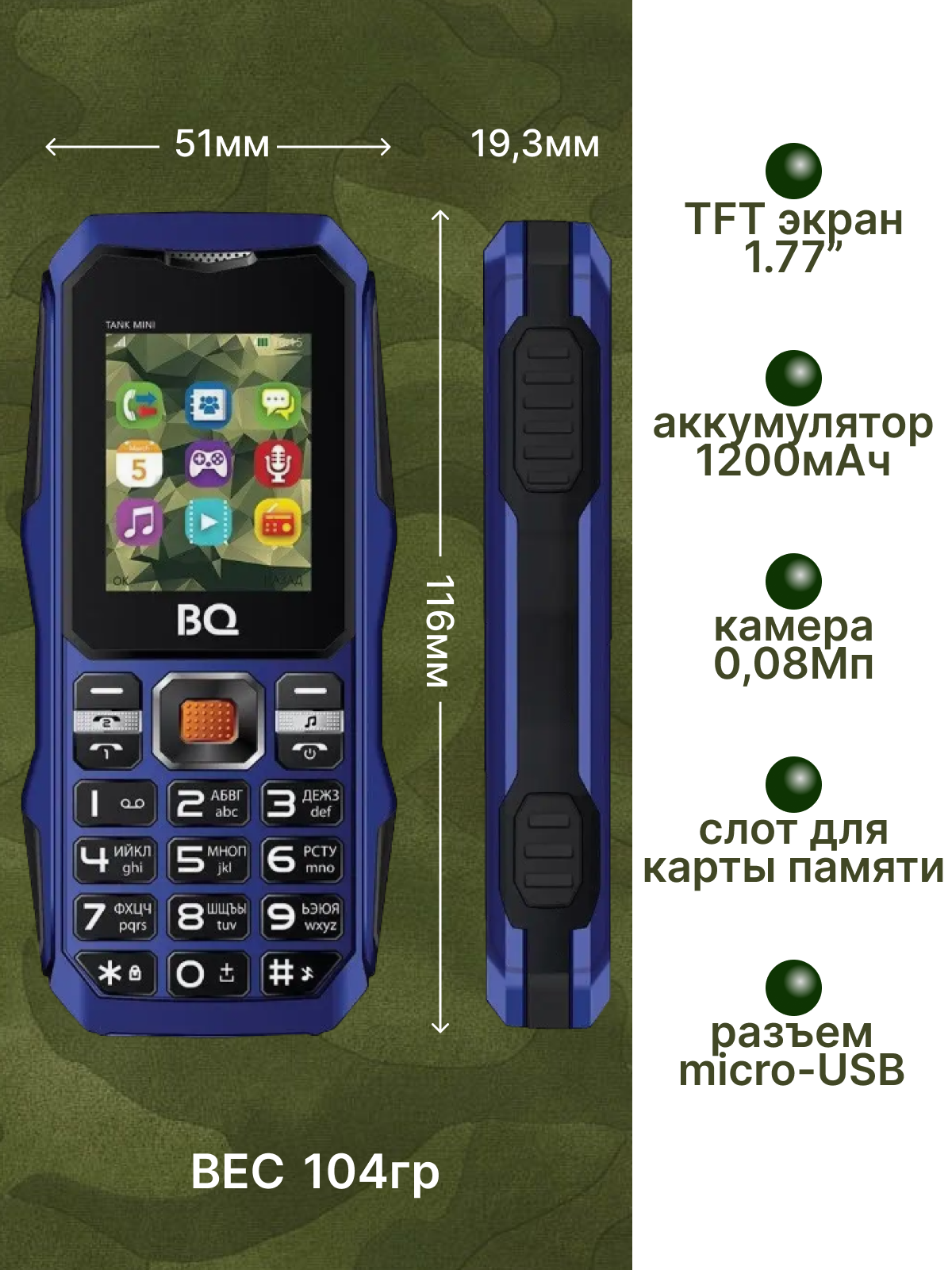 Сотовый телефон BQ BQ-1842 Tank mini D.Green (2sim/1.77"/128*160/32Mb/microSD/-/Bt/1200мАч/моноблок)