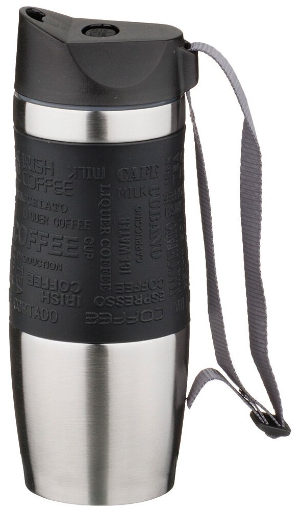 Термокружка AGNESS 400мл с кнопкой стоппером и ремешком нерж.сталь, пластик черная