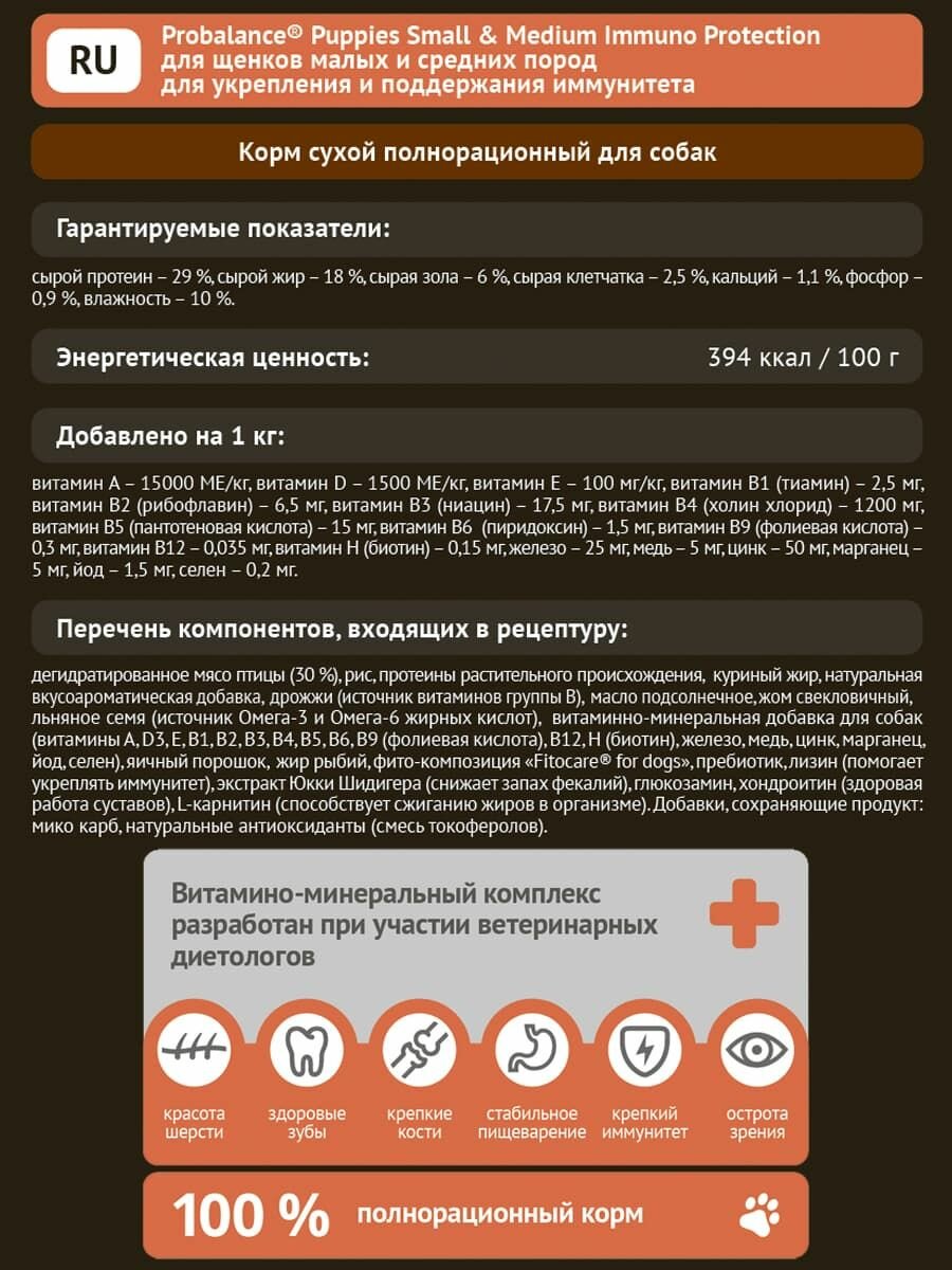 Probalance Сухой корм для щенков малых и средних пород, укрепление и поддержание иммунитета, оптимальное развитие, 3кг