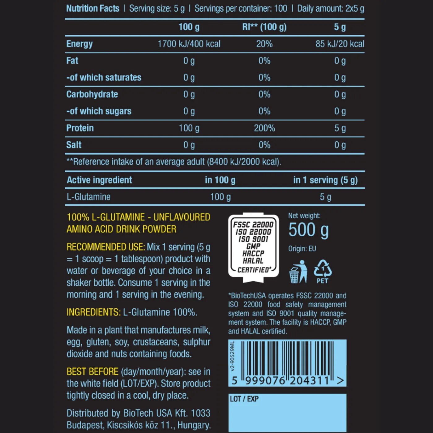 BioTechUSA 100% L-Glutamine 500 гр., нейтральный