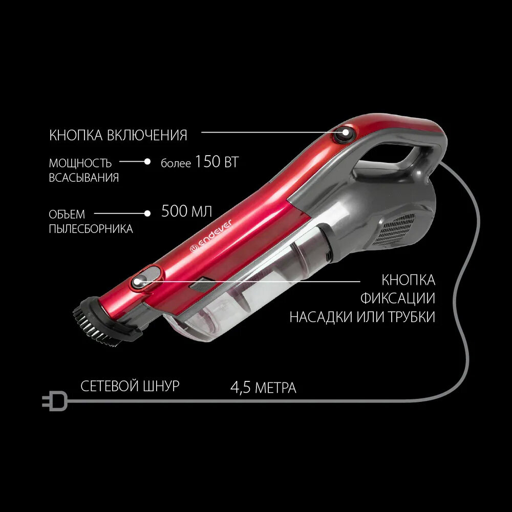 Пылесос вертикальный для дома Endever VC-287/288 2в1 вертикальный/ручной / 600 Вт / мощность всасывания 150 Вт / пылесборник 0,5л / циклонный фильтр, HEPA фильтр