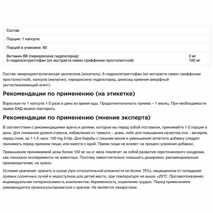 Be first, 5-HTP Capsules (5-ХТП / экстракт гриффонии), 30 капсул 550 ₽ Подробнее