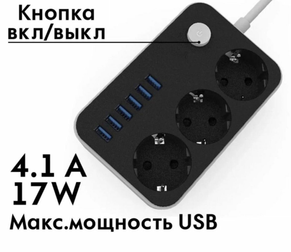 Универсальный сетевой фильтр с 3 розетками, удлинитель тройник разветвитель 6 USB портами, 2 м, Удлинитель с USB, зарядное устройство Type-C PD 20W