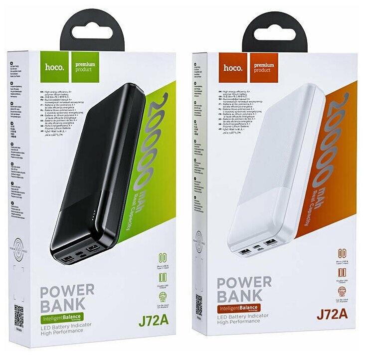 Универсальный Доп. Аккумулятор 20000mAh, J72A, HOCO, 2 USB (5V/2.0A), белый