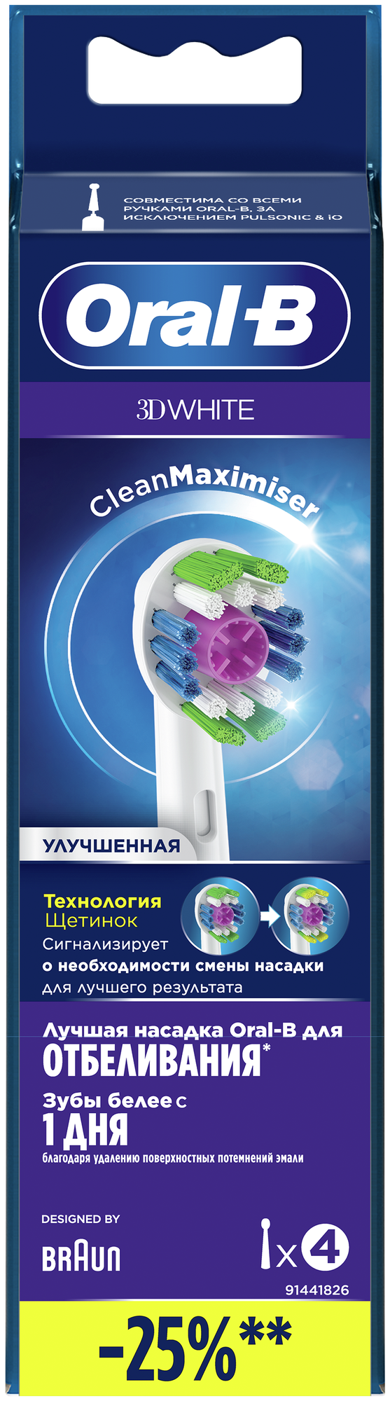 Набор насадок Oral-B 3D White CleanMaximiser для ирригатора и электрической щетки, белый, 4 шт.