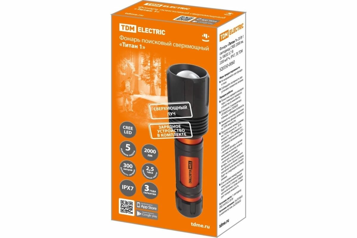 Фонарь Tdm Electric «Титан 1» 20 Вт 1 светодиод CREE 2000 лм, 2х18650 3.7 В 2200 мА*ч, IPX7, ЗУ, SQ0350-0060