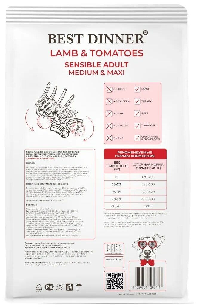 BEST DINNER DOG ADULT MEDIUM & MAXI SENSIBLE для взрослых собак средних и крупных пород с чувствительным пищеварением с ягненком и томатами (15 кг)