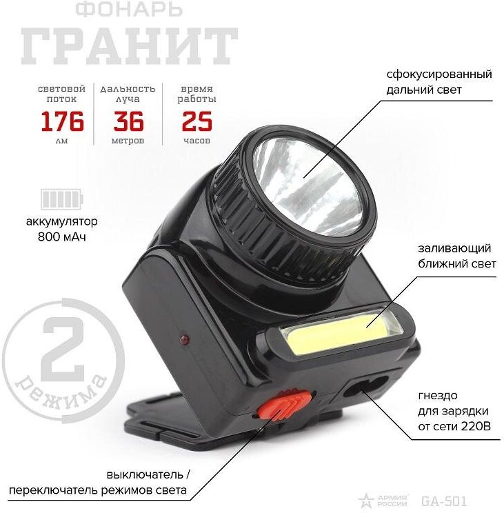 GA-501 Фонари АР армия россии налобный Гранит [3Вт COB + 3Вт LED, ближ и дальн свет, аккум, карт] (3