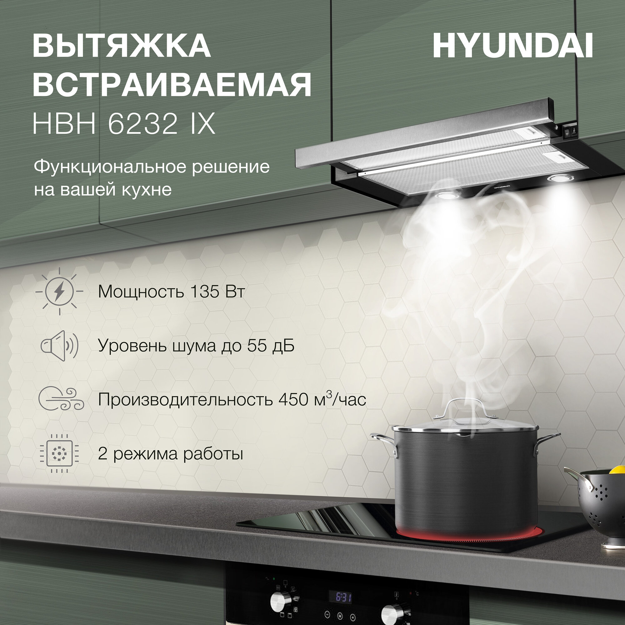 Встраиваемая вытяжка Hyundai HBH 6232 IX, управление кнопочное, нержавеющая сталь/черный