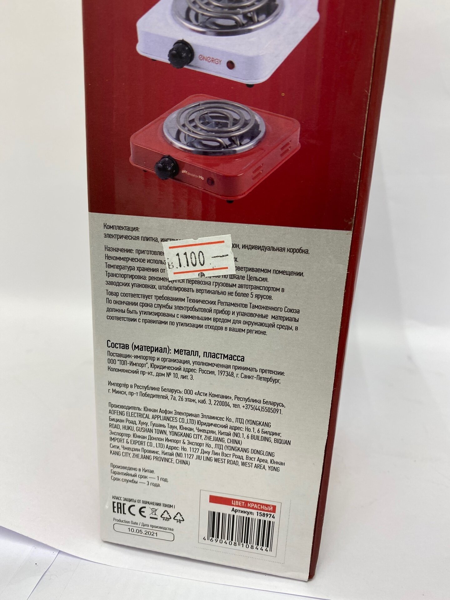 Электроплитка Energy EN-902R, 1 конфорка, спираль (ТЭН) 1кВт, красная 158974