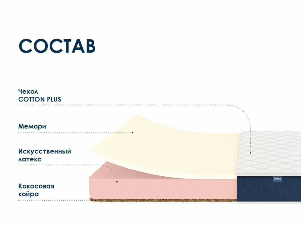 Матрас 95х165 Dimax PracticМемо 16, беспружинный, двусторонний с разной жесткостью, полумягкий, жесткий, memory foam пенополиуретан кокосовое волокно, односпальный 165х95 21 835 ₽ Подробнее