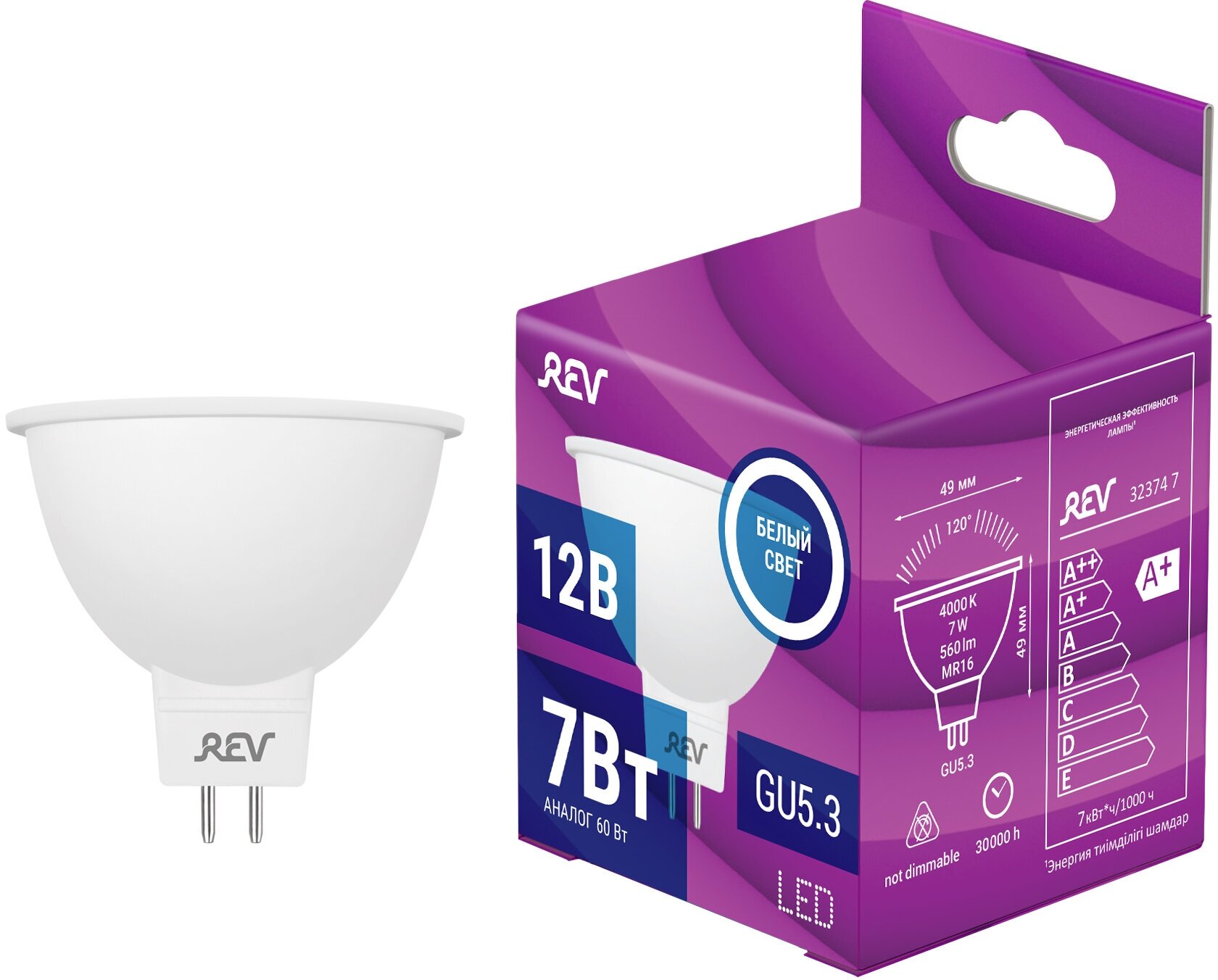 Лампочка светодиодная REV, MR16, 12V, GU5.3, 7W, 4000K, дневной свет