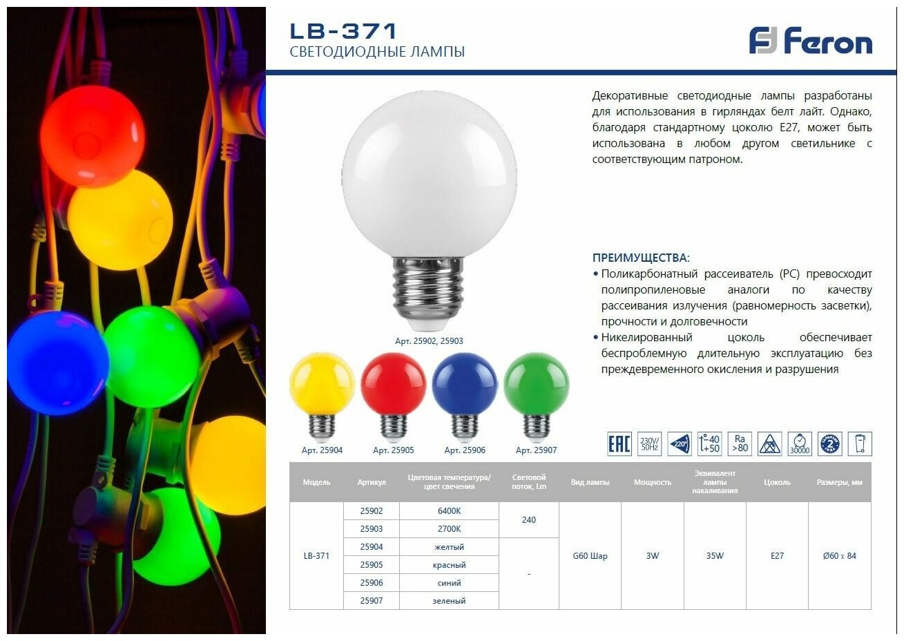 Лампа светодиодная Feron LB-371 Шар E27 3W 230V 6400K матовый 25902 5 шт 870 ₽ Подробнее