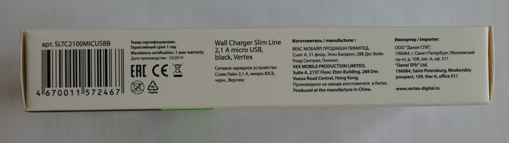 Сетевое зарядное устройство Vertex Slim Line, 2.1 А, кабель microUSB, черное