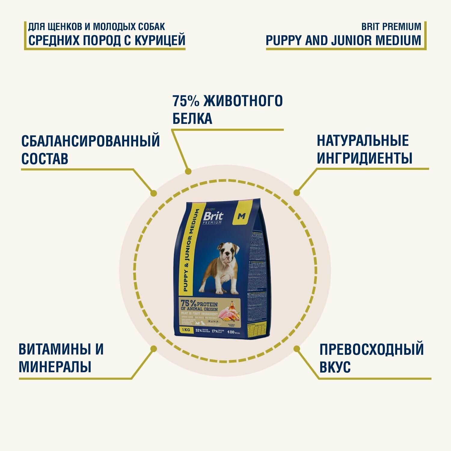 Сухой корм BRIT PREMIUM DOG PUPPY & JUNIOR MEDIUM для щенков и молодых собак средних пород с курицей (1 кг)
