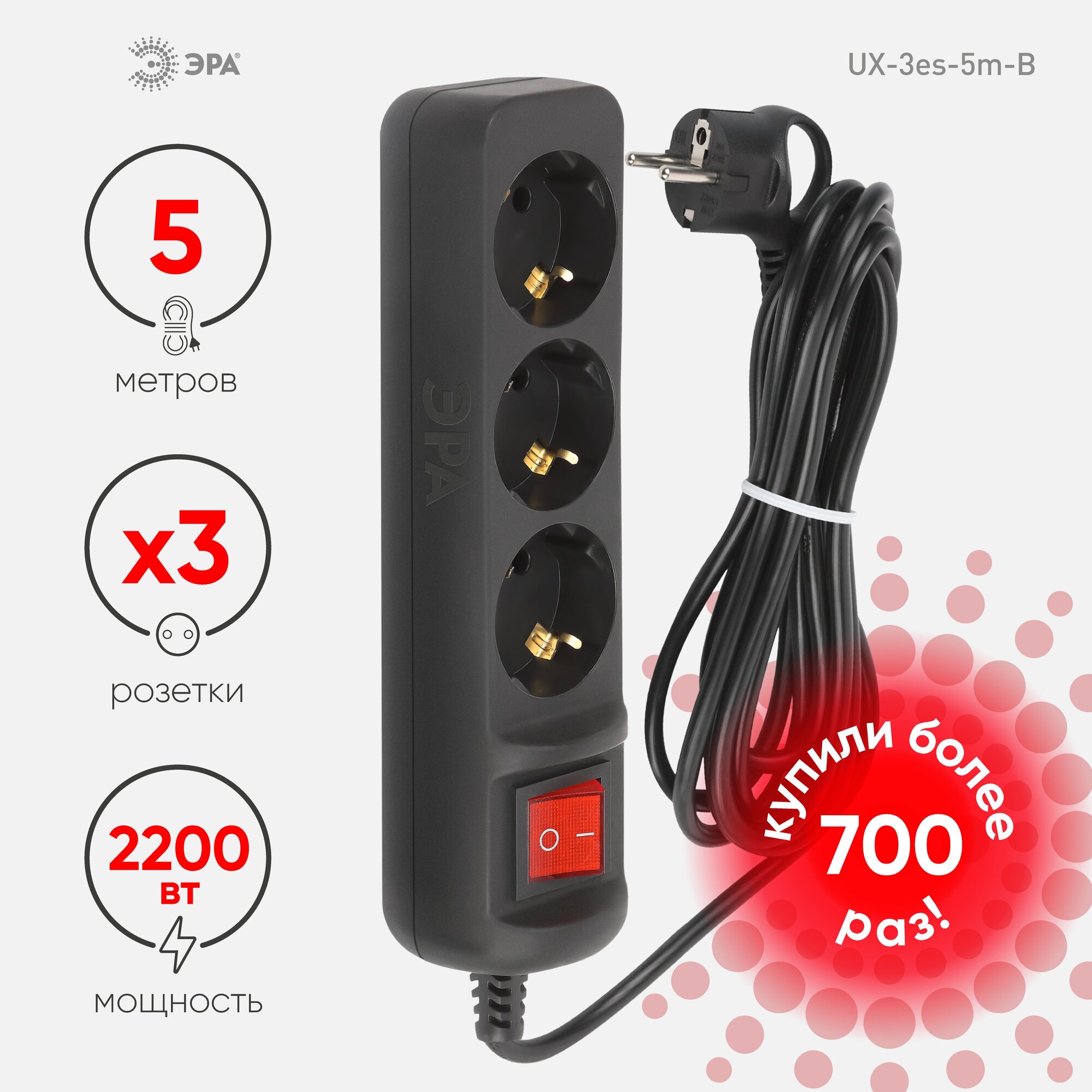 Эра Б0057729 Удлинитель электрический UX-3es-5m-B с заземлением с выключателем 3 розетки 5м ПВС 3x0,75мм2 10А черный