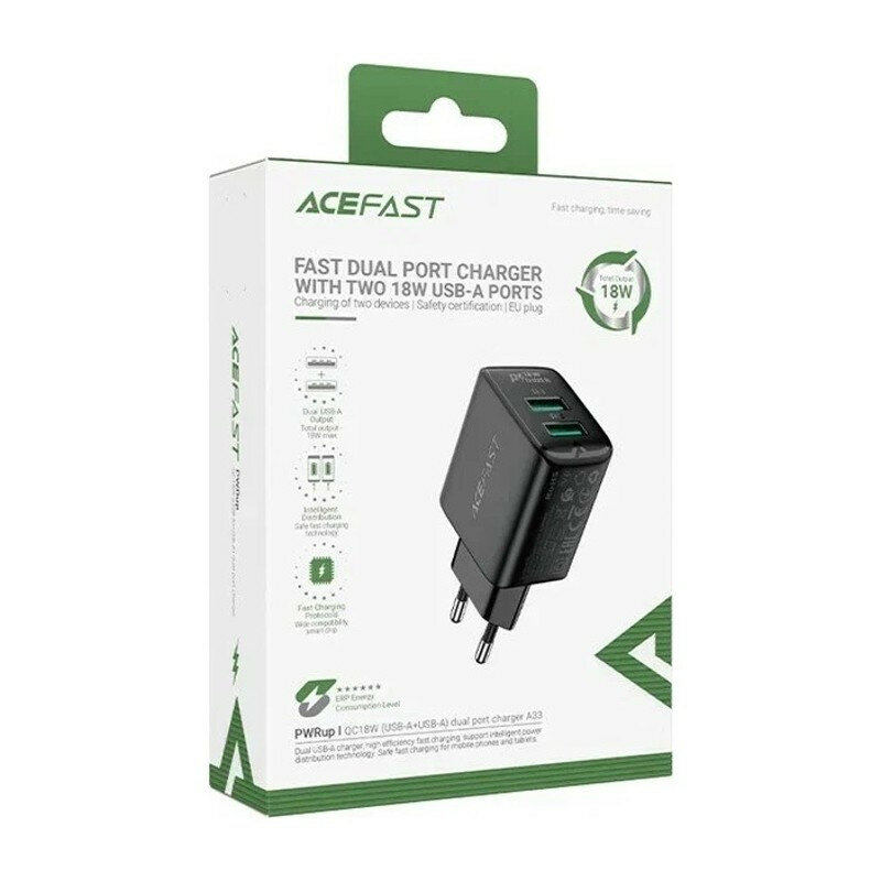 Сетевое зарядное устройство ACEFAST A33 Dual port Charger, QC18W, USB-A + USB-A, Черный