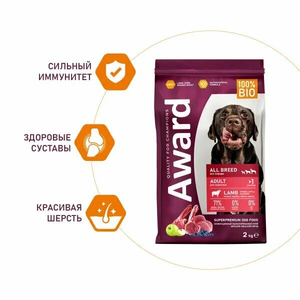 Корм для собак Сухой корм AWARD для взрослых собак всех пород с ягненком с индейкой с добавлением яблока и черники 2кг