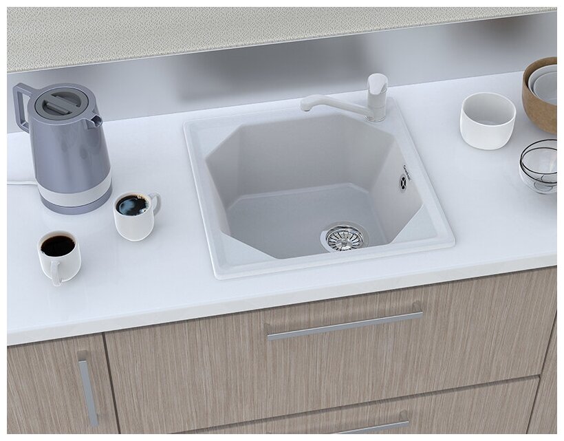 Кухонная мраморная мойка GranFest UNIQUE GF-U-500, квадратная, с сифоном и переливом, 500x500 мм, врезная, цвет белый/Раковина для кухни
