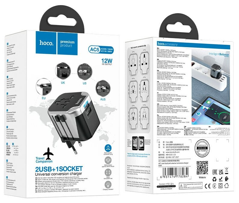Зарядки для гаджетов Сетевое зарядное устройство универсальное HOCO AC5 Level dual port 2xUSB с переходником на евро вилку для розеток, 2.4A, черный