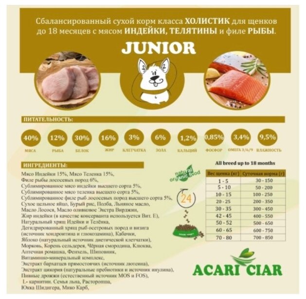 Сухой корм холистик для собак Acari Ciar (щенков с 6 до 18 месяцев) Junior 6,5 кг (гранула Медиум) 6 000 ₽ Подробнее