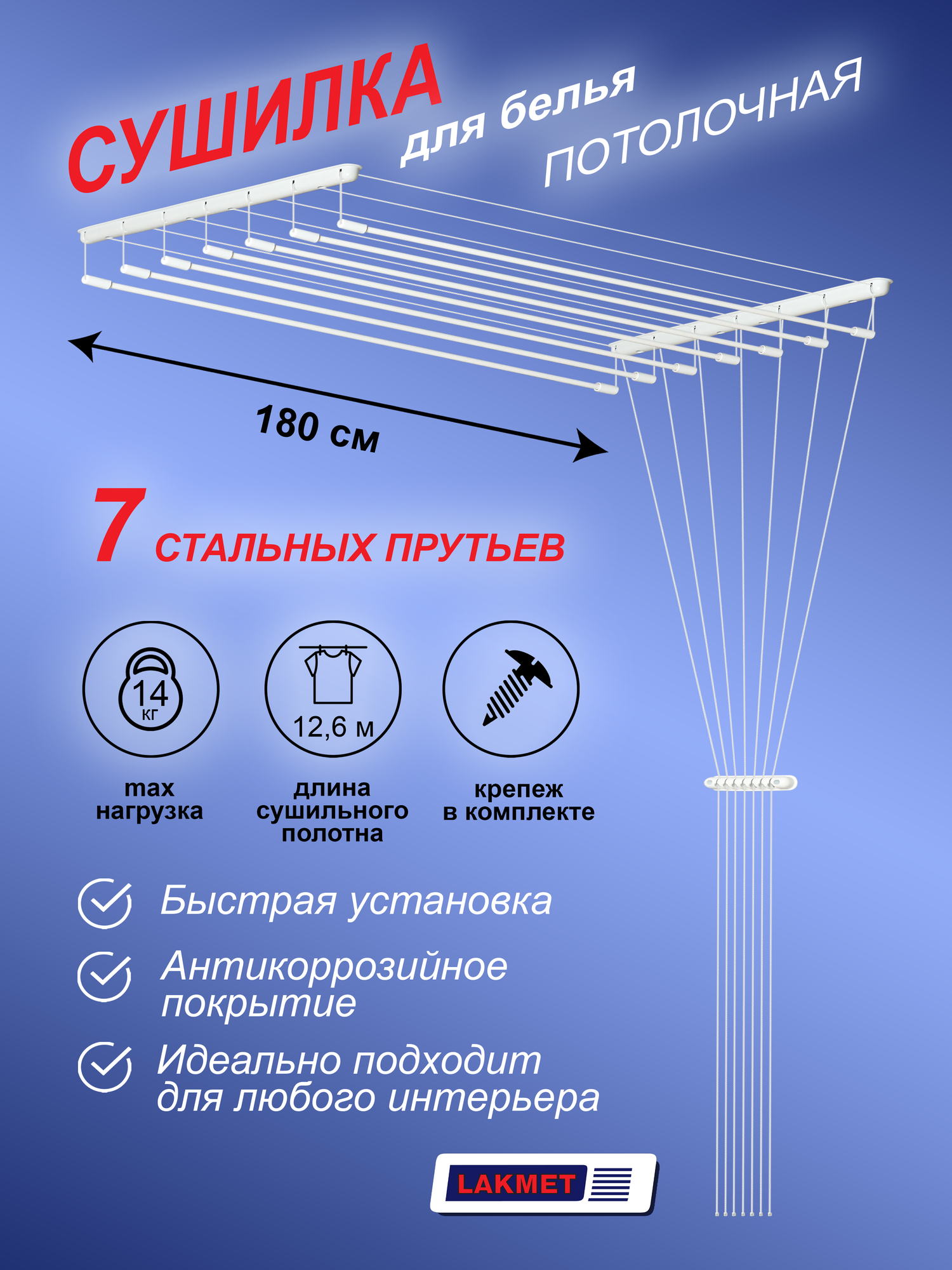 Сушилки для белья Сушилка для белья потолочная Лиана Lakmet 1,8 м., белая, 7 линий